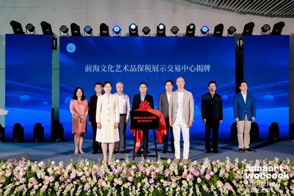 圖源:主辦方提供 深圳市委常委、前海合作區黨工委書記、寶安區委書記王守睿,深圳市委宣傳部常務副部長曾相萊,深圳市文聯主席劉文斌,前海合作區黨工委副書記梁珂,南山區委常委、宣傳部部長王遠輝,蛇口海關副關長戴旭,以及招商局蛇口工業區控股股份有限公司總經理朱文凱,新世界發展有限公司執行董事兼行政總裁黃少媚等出席活動。 在開幕禮上,前海文化藝術品保稅展示交易中心正式揭牌成立。這既是前海落實《深圳建設中國特色社會主義先行示範區綜合改革試點實施方案(2020-2025年)》、《全面深化前海深港現代服務業合作區改革開放方案》、《前海深港現代服務業合作區總體發展規劃》關於“支持建設適用國際通用規則的文化藝術品(非文物)拍賣中心”、“探索文化藝術品展示交易業務”等要求的探索實踐,也是深化深港合作、聯動香港共建中外文化藝術交流中心的切實舉措,以及創新文化藝術品展示交易業態,提升城市藝術影響力的重要內容。與此前深圳通用的暫時進出境模式下涉外展覽和直接交易入境相比,文化藝術品區外保稅展示交易不僅存展便利、程序簡化,而且緩解資金壓力、利好產業發展。