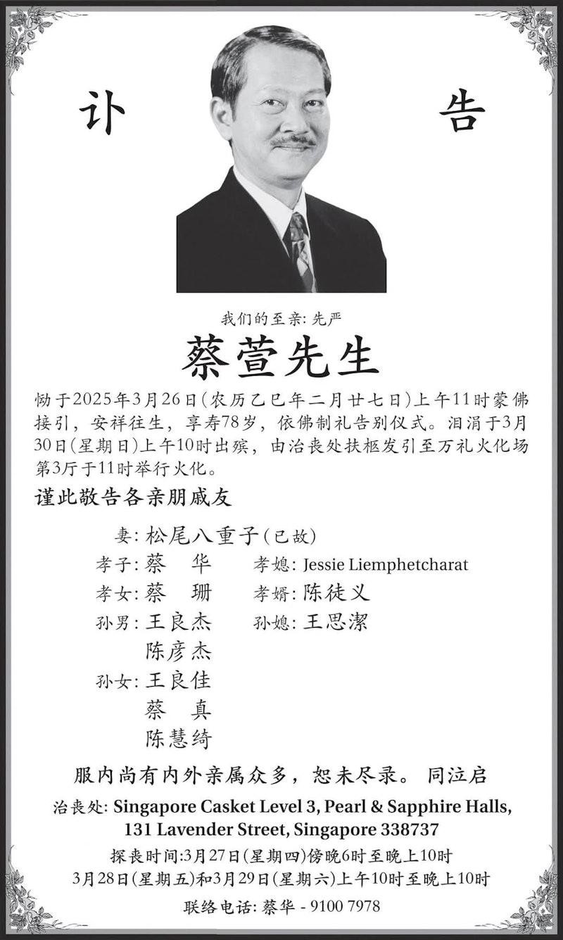 香港新聞網3月27日電被譽為“香港四大才子”之一的蔡瀾,其胞弟蔡萱26日因急性白血病驟逝,享年78歲。 蔡萱的兒子蔡華證實父親的死訊,指叭叭生前患有輕微的骨髓纖維化,2月病情開始惡化,演變成急性白血病,25日覆診時感到呼吸困難和氣喘,被送入急症室。26日,蔡萱不幸病逝。蔡瀾亦因為身體抱恙,無法前往新加坡出席弟弟的喪禮。