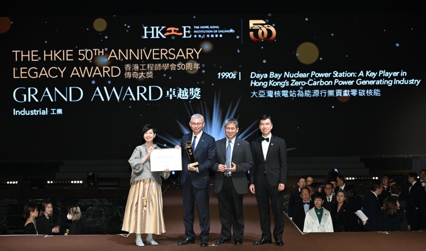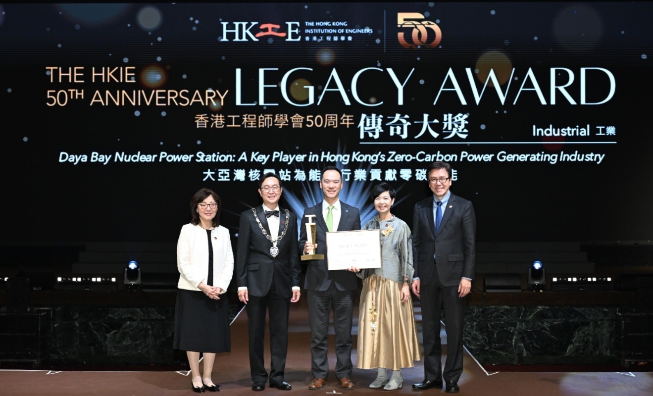 中華電力總裁羅嘉進(中)接受香港工程師學會會長馬紹祥(左二)、發展局局長寧漢豪(左一)、房屋局局長何永賢(右二)及創新科技及工業局局長孫東(右一)頒發“香港工程師學會 50 周年傳奇大獎”的“傳奇大獎(工業)”。 “香港工程師學會 50 周年傳奇大獎”分創新、工業、基建三大組別,旨在表彰過去 50 年傑出的工程項目、突破性技術和變革性舉措。大亞灣核電站從 100 多個提名項目中脫穎而出,先獲選為工業組別五強,取得“卓越獎(工業,1990 年代)”,再經評審團嚴謹篩選及公眾投票,奪得該組別的最高榮譽“傳奇大獎(工業)”。