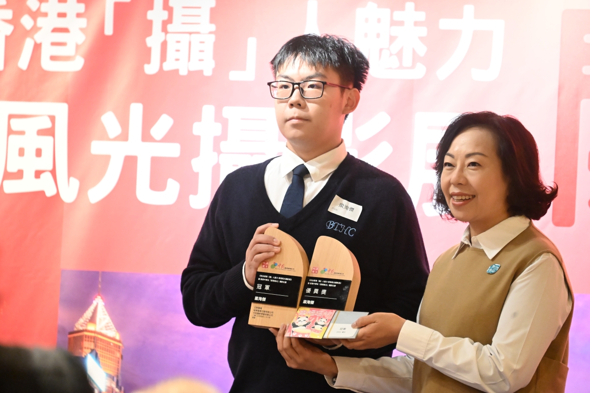 特區政府民政及青年事務局局長麥美娟女士為中學生攝影比賽冠軍梁洵傑頒獎