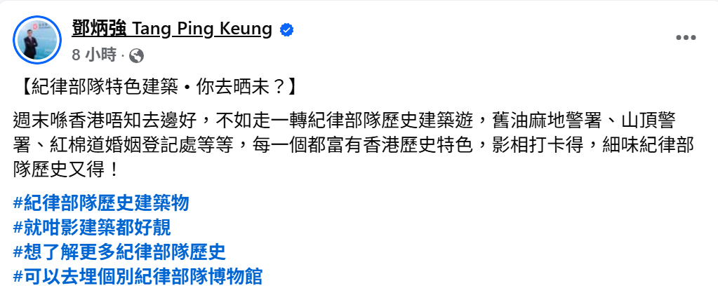 鄧炳強社交媒體截圖 他在貼文上介紹了舊油麻地警署、山頂警署、紅棉道婚姻登記處等歷史建築,並表示每一個都富有香港歷史特色,更指出那裡可以拍照打卡,也可以細味紀律部隊歷史!