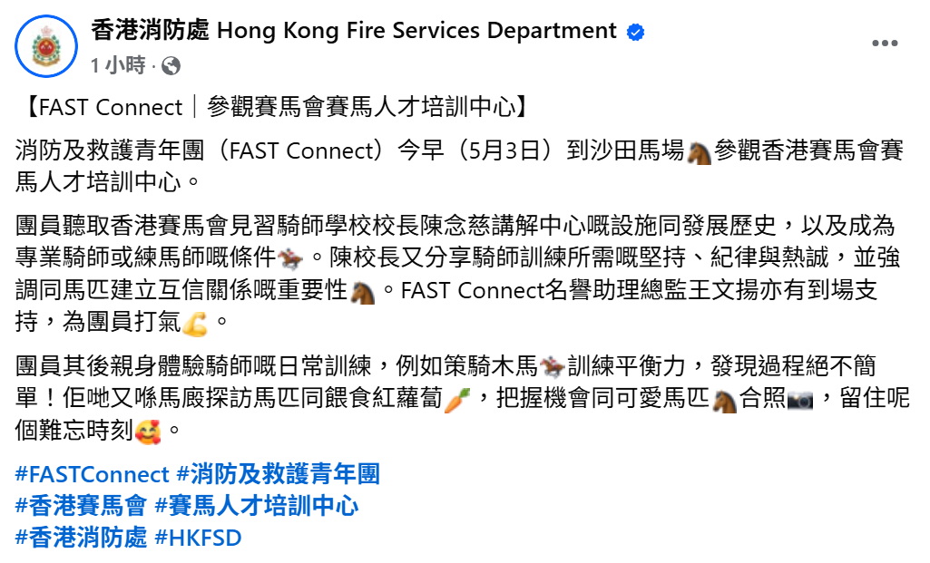 圖源:香港消防處社交媒體截圖 團員們聽取了香港賽馬會見習騎師學校校長陳念慈對該中心設施和發展歷程的介紹,並了解了成為專業騎師或練馬師所需的條件。 陳念慈還分享了騎師訓練所需的毅力、紀律與熱情,強調了與馬匹建立信任關係的重要性。FAST Connect名譽助理總監王文揚也到場為團員加油打氣。 在參觀過程中,團員們親身體驗了騎師日常訓練的,例如通過騎乘木馬來練習平衡力,深刻體會到這項工作的不易。此外,他們還在馬廄探訪了馬匹並餵食紅蘿蔔,利用機會與這些可愛的馬匹合影留念,記錄下這難忘的一刻。 (完)(視頻來源:香港消防處) 【編輯:梁嘉軒】
