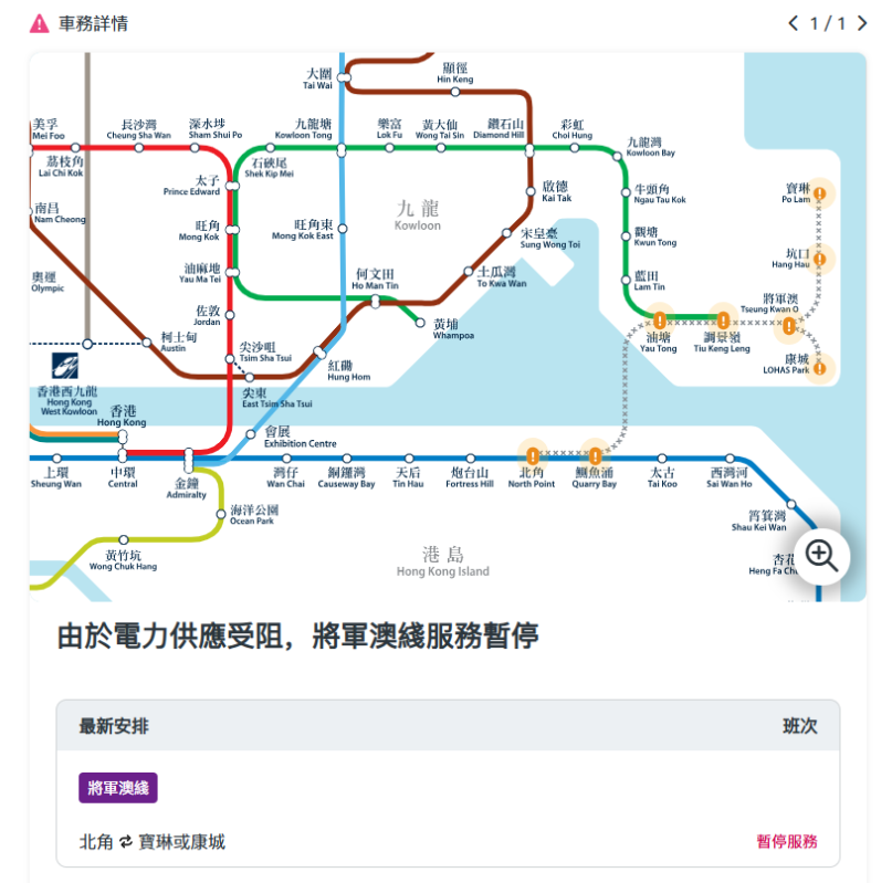 據悉,乘客暫時無法由將軍澳及油塘乘搭列車過海到港島鰂魚涌站,相反亦然。觀塘線列車會駛至調景嶺站,港鐵已安排接駁巴士路線往返將軍澳、坑口、寶琳及康城站。