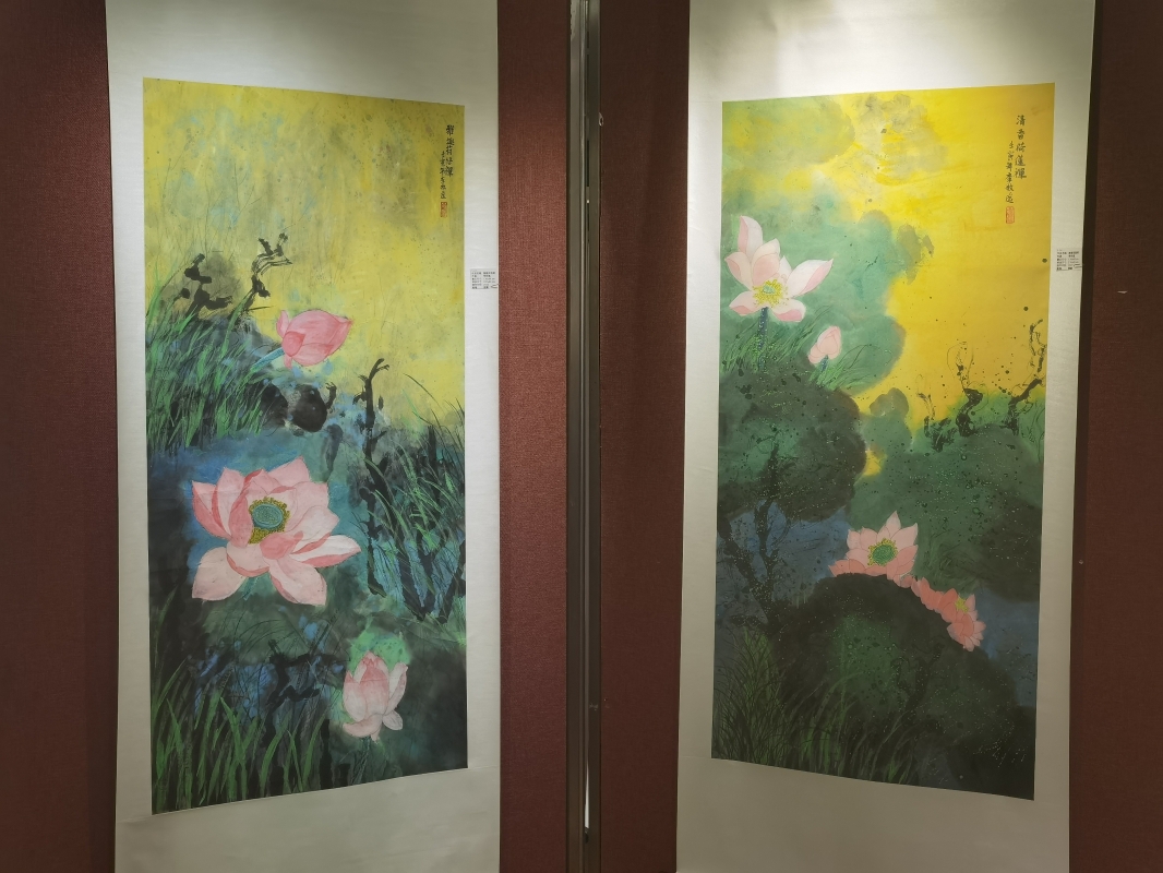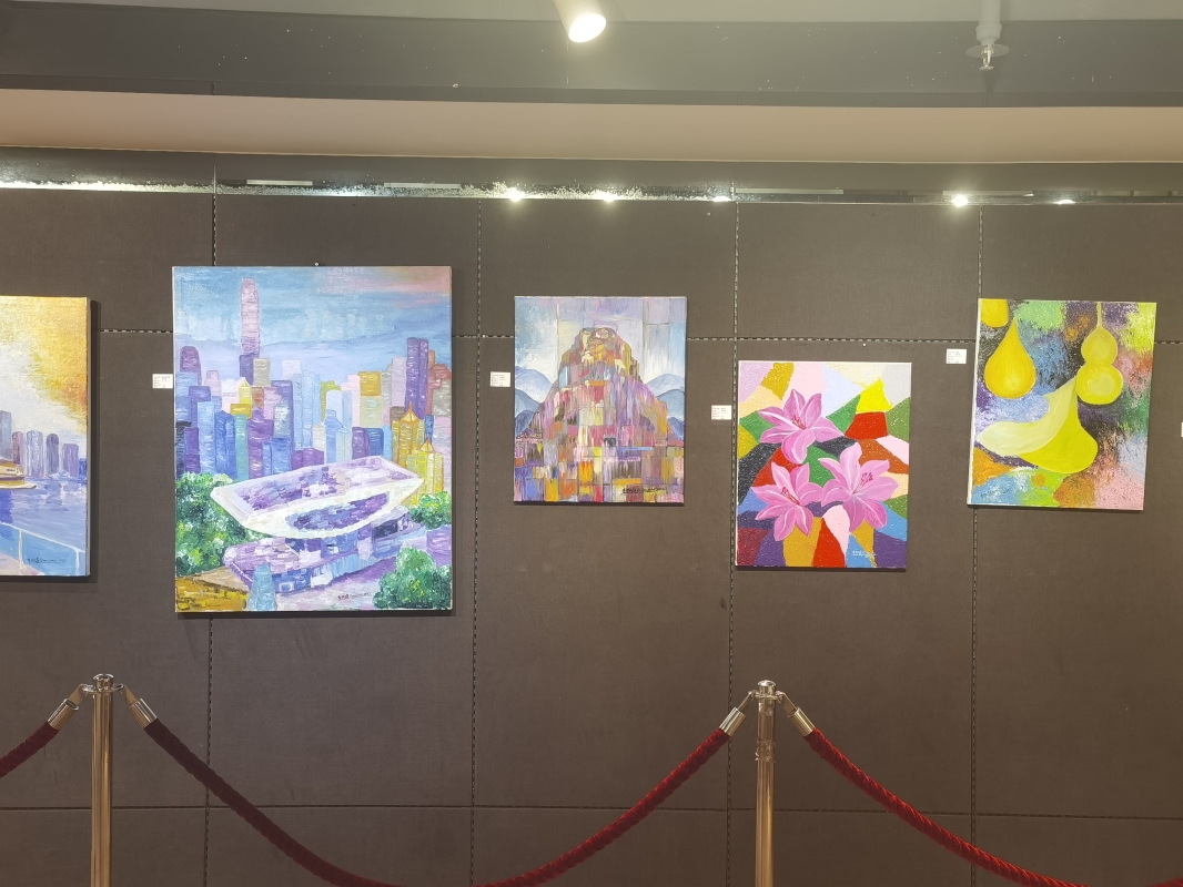 展覽不止匯聚國畫,亦有經典油畫作品展示,包括以藍紫色調繪出的香港會展中心等。畫卷上建築物的墨色、荷蓮等植物的彩色、現代建築的絢麗藍紫色交相輝映,中西方繪畫藝術的筆法與印象相結合,吸引不少遊覽者駐足觀看。 展覽現場還推出李牧遙與藝小T聯名文創服飾,將國貨與藝術相結合,引領“新國潮”風尚。文創服飾設計巧妙,將藝術家的畫作“穿”在身上,遊覽者同樣可從現場畫作中找到系列作品的源頭。裕華國貨為此特設專區展售,提供T恤、套頭衫等服裝,價位在100至200多港元不等,將藝術之美滲透進日常生活。
