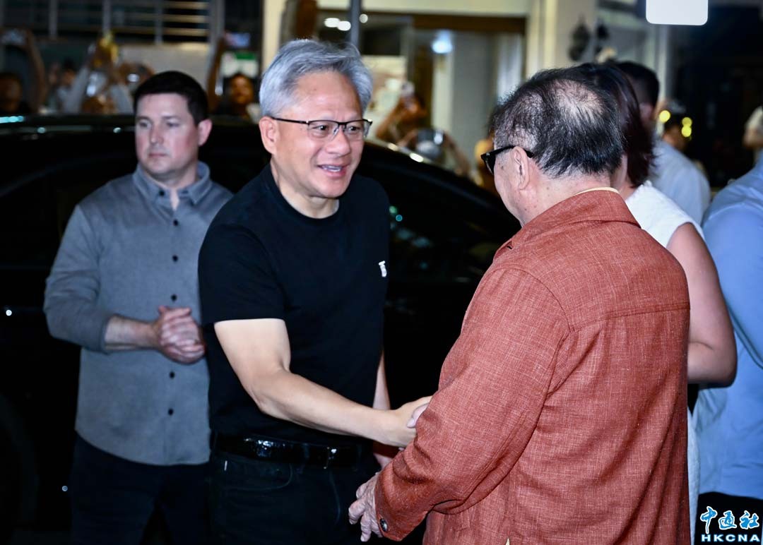 5月20日晚上,英偉達(NVIDIA)執行長黃仁勳一家與林百里、張忠謀、張淑娟夫婦相約聚餐。圖為黃仁勳(左)和廣達董事長林百里。 香港中通社圖片