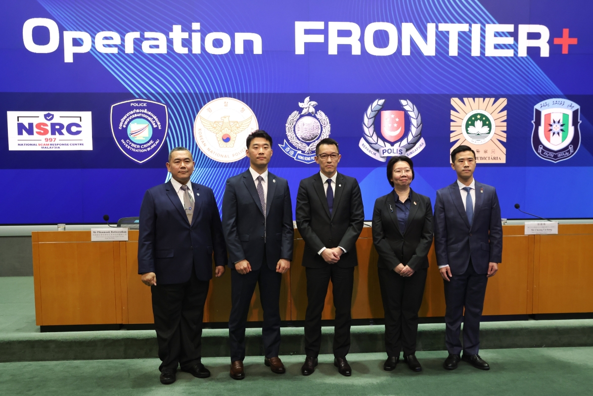 香港警務處商業罪案調查科總警司黃震宇(中)、新加坡警察部隊反詐騙指揮處助理警察總監葉葛心(右二)、大韓民國警察廳國家反詐中心警正Sanghyun Park(左二)、泰國國家警察網絡犯罪調查局警察上校Piboonsook Ratiwerotkun(左)和澳門司法警察局反詐騙協調中心負責人張遠鴻(右)出席記者會。