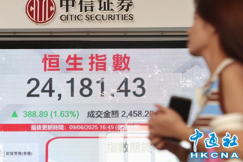 香港中通社6月9日電(記者 徐嘉儀)市場憧憬中美貿易談判,港股進一步走高,恆生指數9日收市升388點,報24181點,創下逾兩個半月高位。大市成交額為2458億港元。
