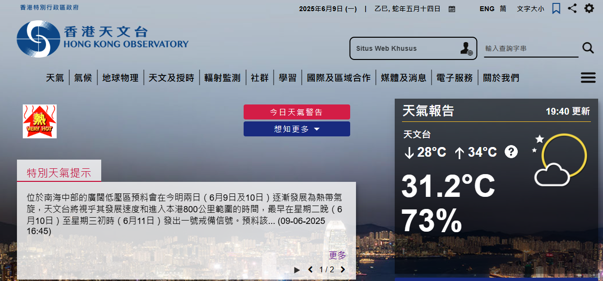 香港天文台網頁截圖 受高空反氣旋影響,華南沿岸普遍晴朗及酷熱。8日下午,香港沙田、九龍城、元朗等多區氣溫達34度以上,部分地區如上水及打鼓嶺更超過35度。天文台發出酷熱天氣警告,並預計熱帶氣旋“蝴蝶”即將形成。