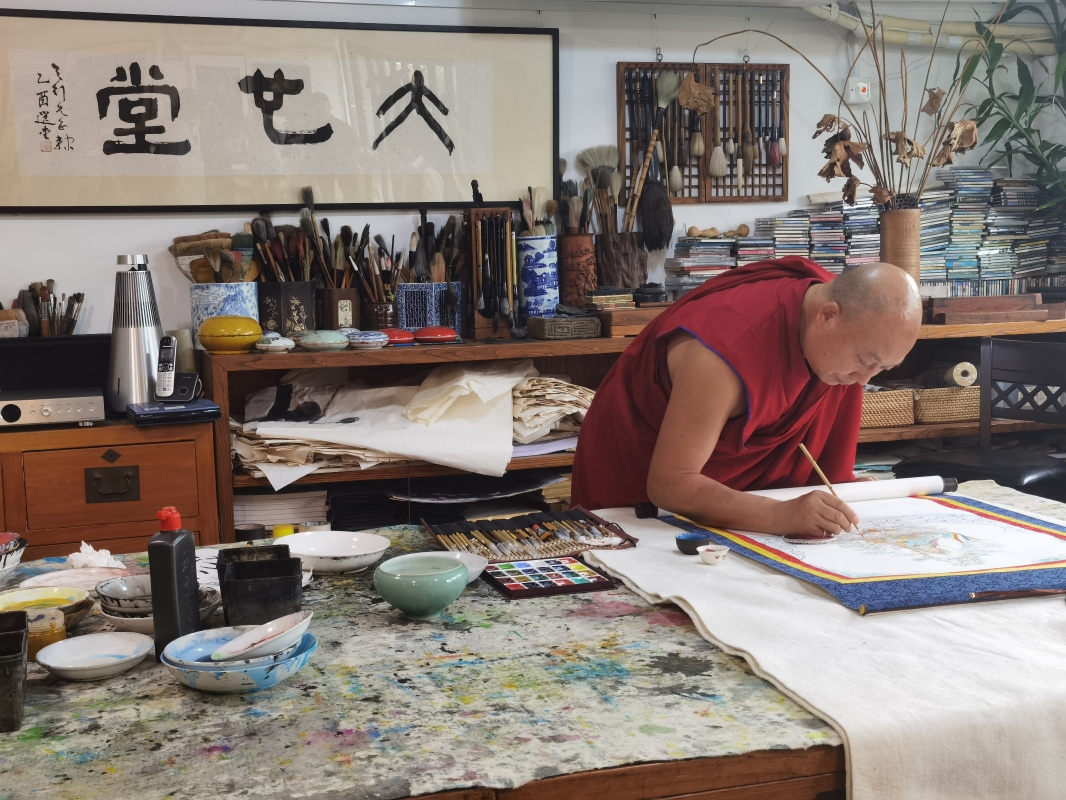 在林天行看來,此次能夠與羅藏旦巴大師合繪,是非常難得的機會,也別有意義,更是兩地文化藝術的一次交流融合。“大師筆下的唐卡,非常慈祥、安靜,熟練的技術更不必多言。” “蓮葉的綠色,代表生生不息;顏色和大小也相互排列。”林天行在繪製蓮花時,亦格外注意配色、花朵和畫面整體的和諧。他所採用的配色,與羅藏旦巴繪製的蓮花生大士身上的色彩互相對應,上下和諧。 談及兩地文化藝術的碰撞時,羅藏旦巴和林天行均欣於見證這種發展。羅藏旦巴期望,能有更多人認識和了解到唐卡這種非遺藝術;香港正值非遺月,他早前亦在香港大學舉辦有關唐卡與AI的講座,探討更多唐卡藝術發展。