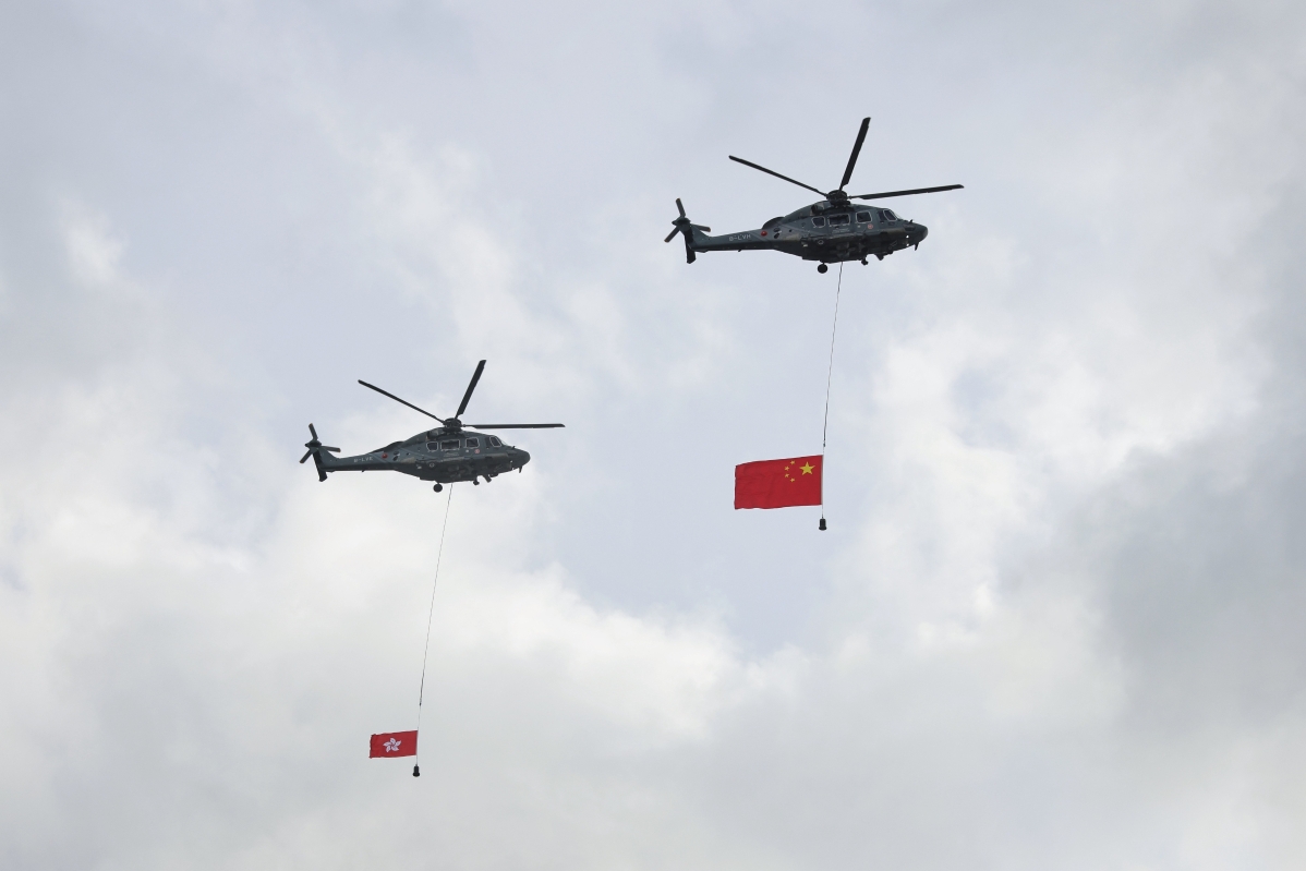 香港特區政府飛行服務隊直升機在維多利亞港上空飛過,展示大型的國旗和區旗 【編輯:洪少葵】