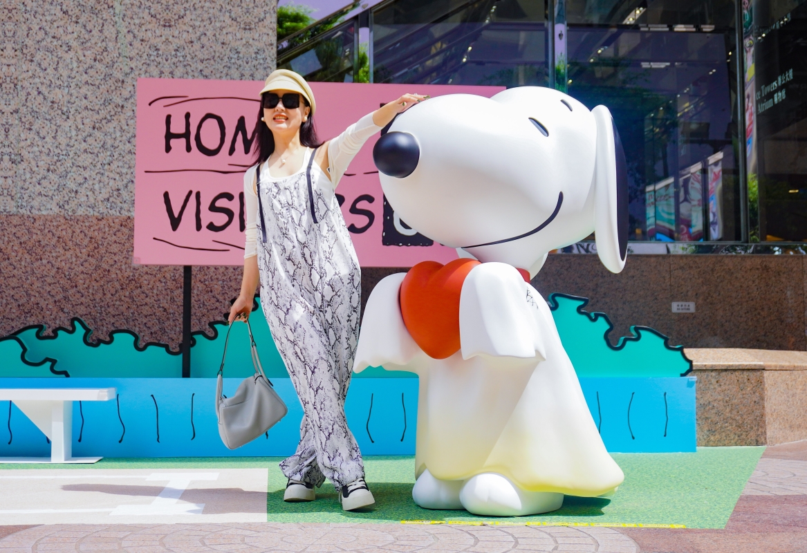 遊客在史努比旁留影