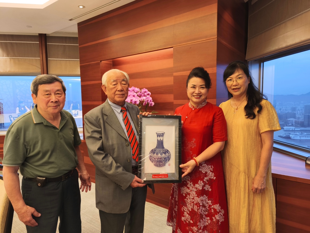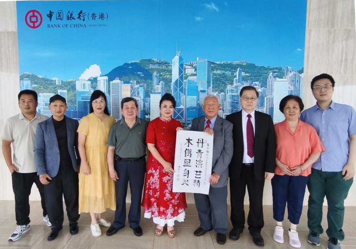 圖為7月18日,林廣兆先生(右四)在中國銀行總部接見來自家鄉的木偶藝術家莊陳華、莊晏紅及香港漳州市區同鄉會林紹奮一行並贈送墨寶。