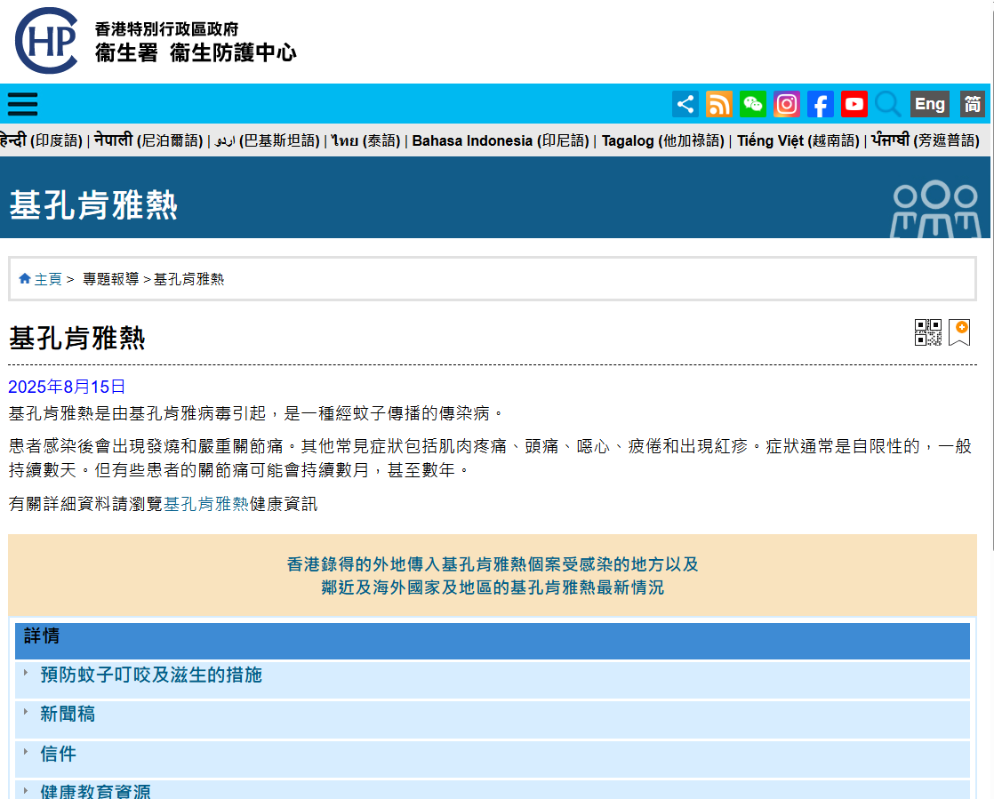 香港今年累計錄得9宗基孔肯雅熱確診個案,均屬輸入個案。本港在2016至2019年每年錄得介乎1至11宗輸入個案。 中心港口衞生科繼續在各個口岸加強巡查,並提醒跨境公共交通營辦商及其他相關單位確保環境衞生良好及有效落實防蚊措施。此外,港口衞生科人員亦會向旅客派發宣傳單張、為抵港人士進行體溫篩查、為發燒或出現相關病徵的旅客進行健康評估,及在有需要時轉介旅客到醫院作出跟進。 為加強長者對預防基孔肯雅熱的意識,衞生署長者健康服務的外展分隊透過在長者地區中心及長者鄰舍中心舉行的講座,向長者講解預防基孔肯雅熱及提供外遊健康建議,並提醒安老院舍加強防控蚊患措施。衞生署轄下的母嬰健康院、學生健康服務中心及健康評估中心亦會提醒孕婦、嬰幼兒照顧者、學生有關基孔肯雅熱的症狀和預防措施。 為加強對少數族裔的支援,有關基孔肯雅熱的重要資訊亦已翻譯成十種少數族裔語言(包括印度語、尼泊爾語、巴基斯坦語、泰語、印尼語、他加祿語、越南語、旁遮普語、僧伽羅語及孟加拉語)並上載至衞生防護中心網站。 中心總監徐樂堅醫生提醒市民,目前,市面上並沒有獲國際衞生當局認證的快速測試產品,供市民自行測試基孔肯雅熱。若懷疑感染基孔肯雅熱,應立即就醫,不應自行進行檢測,以免延誤診治。市民亦不應自行用藥,尤其是阿司匹林或非類固醇消炎藥(如布洛芬),因這些藥物可能引起嚴重副作用,例如增加出血風險。一般而言,兒童不應服用含有阿司匹林的藥物去舒緩發燒和其他症狀,以防引致“雷爾氏綜合症”,一種嚴重及可致命的併發症。 他補充,在雨季期間應做好防蚊措施,預防蚊傳疾病。使用含避蚊胺或其他有效活性成分的昆蟲驅避劑可有效防蚊,但使用時應注意以下事項: 先仔細閱讀標籤說明; 在進入可能被蚊叮的範圍前使用; 塗在外露皮膚及衣服; 孕婦使用避蚊胺的濃度上限是30%,兒童則為10%(如前往蚊傳疾病流行的國家或地區而有機會被蚊叮咬,兩個月或以上的兒童可使用濃度上限為30%的避蚊胺); 先塗防曬霜,再塗昆蟲驅避劑; 遵照標籤說明,只於有需要時重複使用;及 除了避蚊胺之外,市面上亦有含其他活性成分的昆蟲驅避劑,例如IR3535、埃卡瑞丁(亦稱派卡瑞丁)等。公眾使用任何昆蟲驅避劑時,應遵從產品標籤上的使用說明及注意事項。 此外,食物環境衞生署(食環署)呼籲市民繼續提高警覺及攜手合作,及早於家居及其他環境採取防蚊及滅蚊措施,包括視察家居及附近環境、徹底清除可供蚊子滋生的地方、每周最少一次徹底更換花瓶的水及擦洗內壁並清倒盆栽墊碟的水、妥善棄置汽水罐和飯盒等容器。此外,食環署亦建議市民和物業管理公司,應經常保持溝渠暢通及填平凹陷的地面,以防積水,並每周最少一次以鹼性清潔劑擦洗溝渠和排水明渠,除去可能積聚的蚊卵。 (完) 【編輯:譚暢】
