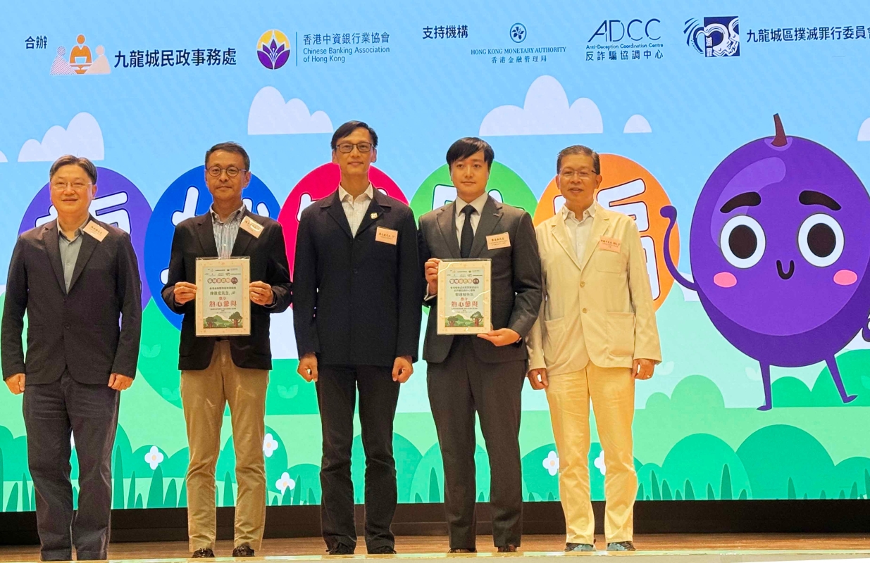 九龍城民政事務專員蔣志豪(中)向金融管理局陳景宏助理總裁(左二)與及警務處商業罪案調查科反詐騙協調中心黎達程督察(右二)頒發感謝狀。