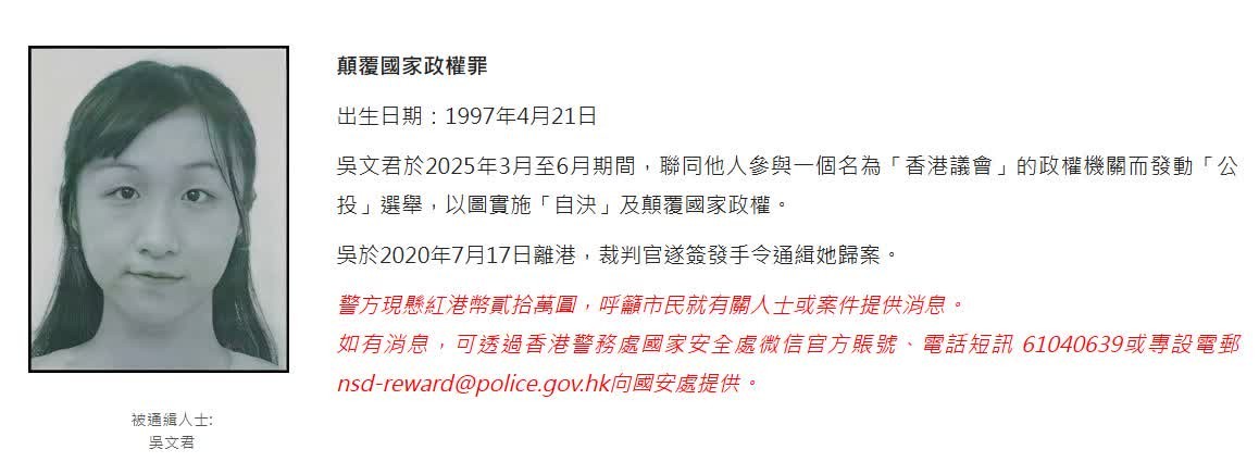 圖為香港警方通緝令。 據了解,涉“顛覆國家政權罪”的吳文君,於2025年3月19日至2025年6月30日期間,作為候選人參與“香港議會”選舉,以圖實現“香港議會”的目標,推翻、破壞《中華人民共和國憲法》所確立的中華人民共和國根本制度或推翻中華人民共和國中央政權機關或者香港特別行政區政權機關。吳文君當選後宣誓就任為“香港議會議員”。(完) 【編輯:豐悅】