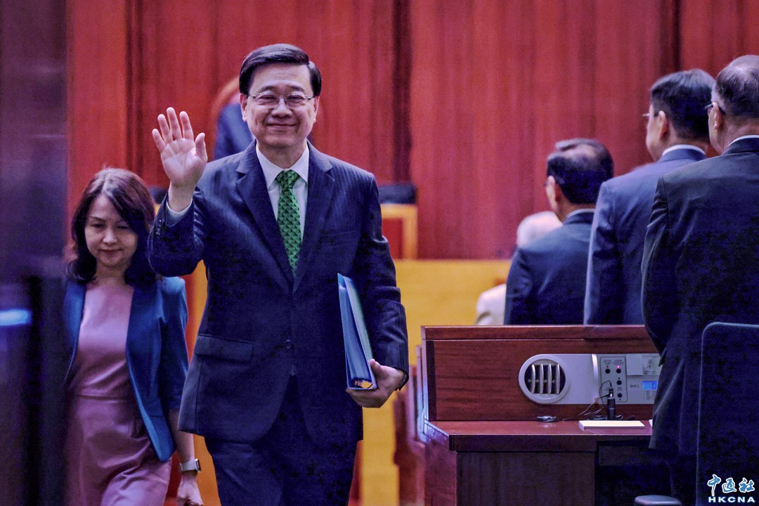 9月17日,香港特區行政長官李家超在立法會發表2025年施政報告,這是他任期內的第四份施政報告。報告以綠色為封面顏色,主題是“深化改革 心繫民生 發揮優勢 同創未來”。圖為李家超走出會議廳。(香港中通社記者 謝光磊攝)