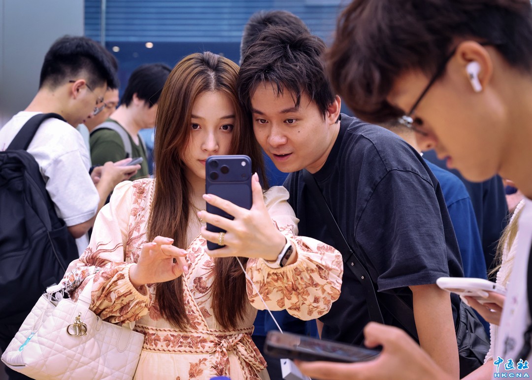 9月19日,蘋果公司iPhone 17系列手機正式在香港開售,吸引大批顧客在尖沙咀apple store進行體驗。(香港中通社記者 謝光磊攝)
