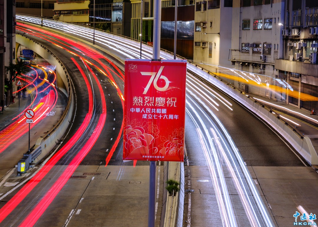 臨近國慶節,香港各區張燈結彩,旗幟飄揚。南區街道掛滿慶祝國慶標語在夜幕下與川流不息的車流光軌相互映襯。(香港中通社記者 徐文峰攝)