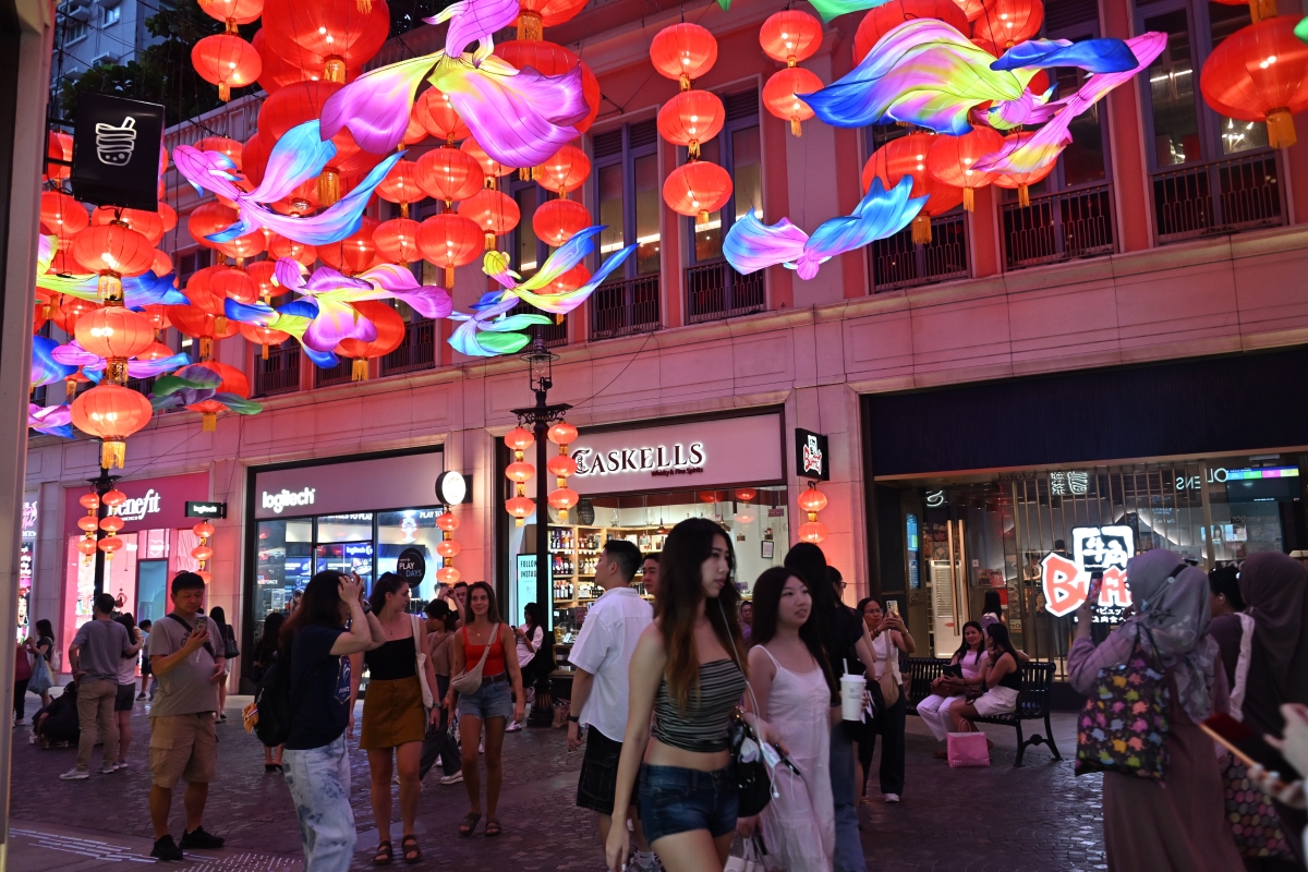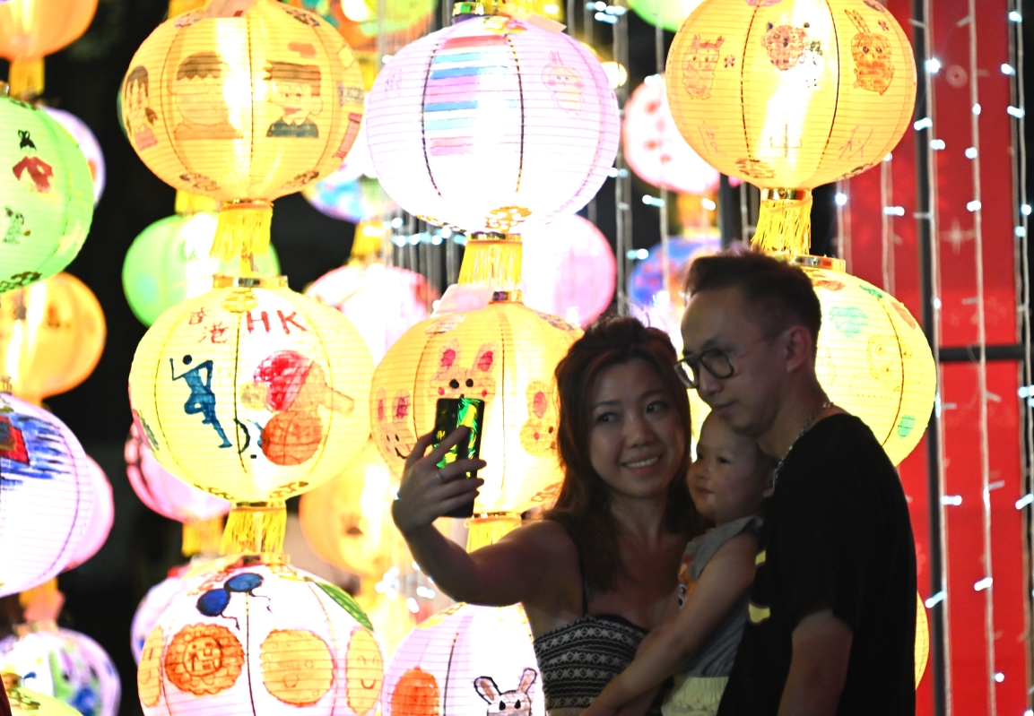 香港新聞網10月5日電(記者洪少葵)10月5日,內地“雙節”旅遊黃金周踏入第五天,赴港旅遊熱潮持續升溫。大量旅客蒞臨香港度假休閑。當天晚上,中秋節前夕的香港灣仔利東街人山人海,紅燈籠和金魚彩燈為中秋節增添喜慶氛圍。臨近的一級歷史建築“藍屋”點亮主題為“悅夜月藍”的彩燈藝術裝置,逾700個由香港藝術家和灣仔街坊手繪的花燈,吸引大批市民和遊客欣賞和拍照打卡。在銅鑼灣維園中秋節彩燈會更是內容豐富,除了展示不同主題的璀璨彩燈,亦會安排各式各樣的活動,并加入非物質文化遺產的元素,如傳統花燈扎作展示等,與大家共慶佳節。 中秋節正日(10月6日)將延長亮燈時間至凌晨12時。 據香港官方統計,自10月1日開始的黃金周首四天,內地訪港旅客突破87.7萬人次,較去年同期增長逾7%,同時海外旅客亦錄得約12.6萬人次,按年大幅上升超過30%,合計突破百萬人次。