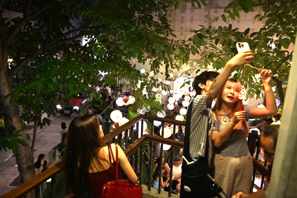 “藍屋”點亮主題為“悅夜月藍”的彩燈藝術裝置,逾700個由香港藝術家和灣仔街坊手繪的花燈,吸引大批市民和遊客欣賞和拍照打卡