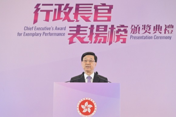 圖為政務司副司長卓永興(第一排中間)、立法會主席梁君彥(左五)、民青局局長麥美娟(右五)等嘉賓出席頒獎典禮。