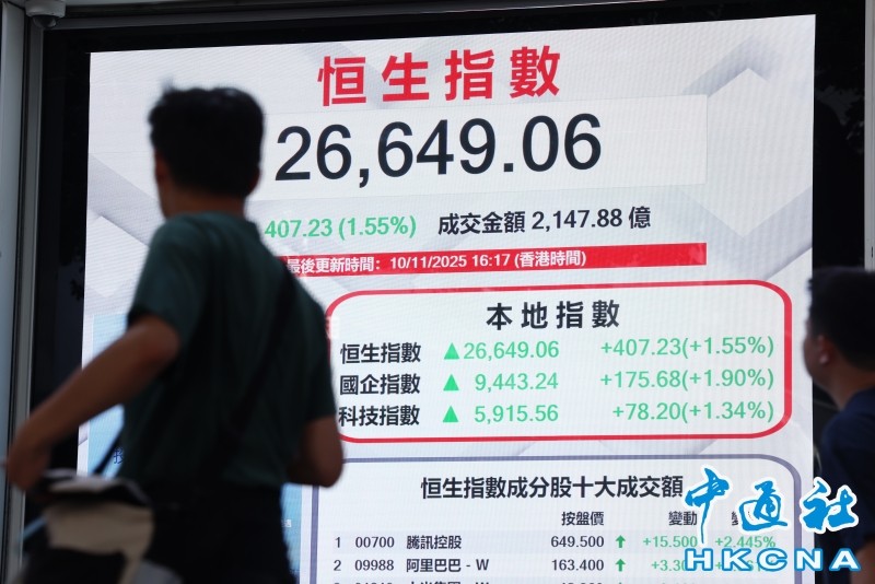 香港中通社11月10日電(記者 梁嘉軒)內地公佈系列經濟數據,加上有消息致市場憧憬美國聯邦政府結束停擺,港股10日造好,恆指全日升407點或1.6%,收26649點,創逾1個月收市新高。