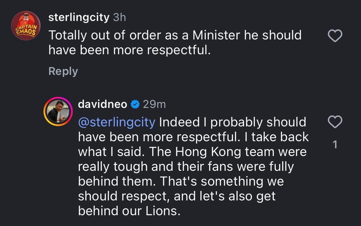 香港新聞網11月20日電 近日,新加坡署理文化、社區及青年部長梁振偉(David Neo)在向本國足球隊球員講話時失言的影片,在網絡引發爭議。梁振偉緊急道歉,他表示應該展示更多的尊重,“我收回我之前說的話。香港隊確實很強悍,他們的球迷也全力支持他們。”