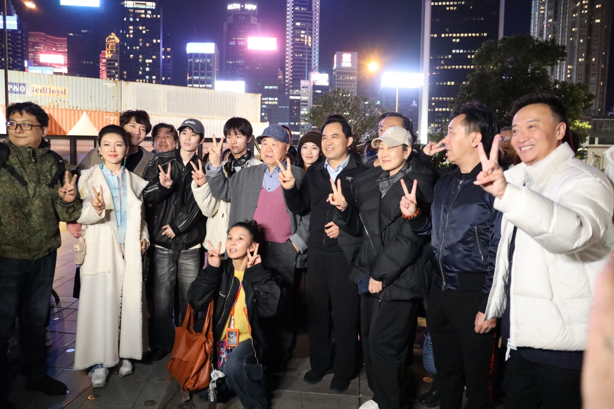 莫言首部話劇《鱷魚》榮膺文華獎後首登香港,與演出團隊在灣仔觀看無人機表演。
