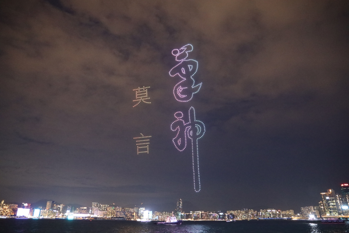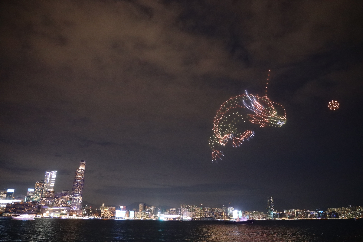 為迎接《鱷魚》香港首演,灣仔海面舉行兩場無人機燈光秀表演。