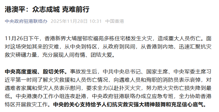 港澳平:眾志成城 克難前行香港新聞網11月28日電 中央政府駐港聯絡辦11月28日發表題為《眾志成城 克難前行》的評論文章,全文如下: 11月26日下午,香港新界大埔屋邨宏福苑多棟住宅樓發生火災,造成重大人員傷亡。面對這場突如其來的災難,從中央到特區,從政府到民間,從香港到內地,迅速匯聚抗災救災磅礴力量,充分展現人間有情、團結大愛。