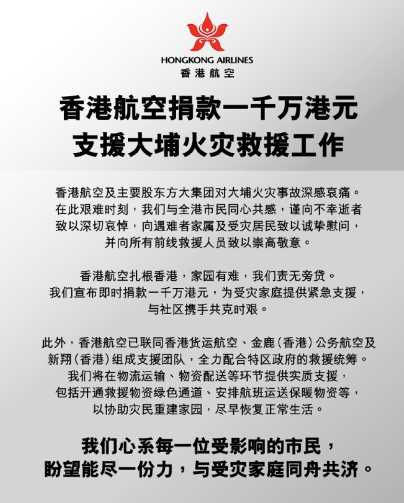 香港新聞網11月28日電 香港航空發佈公告,捐款一千萬港元支援大埔火災救援工作。