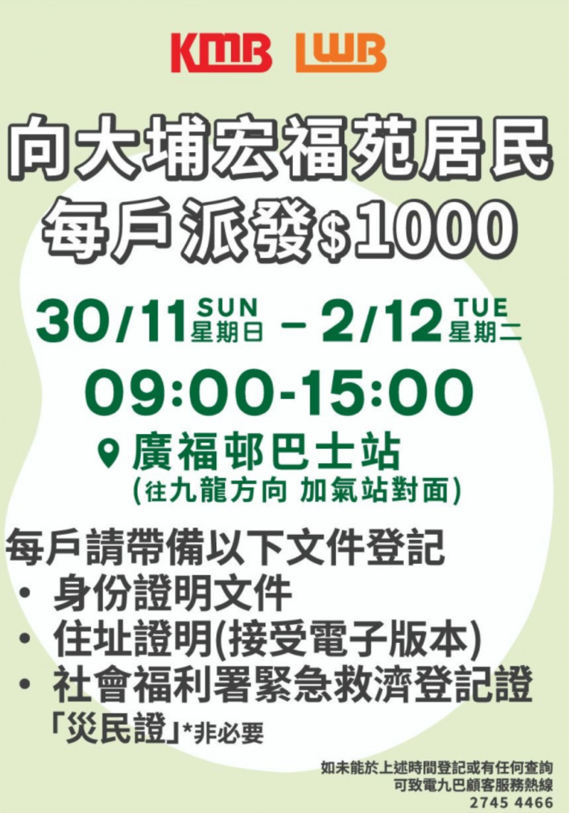 香港九龍巴士向大埔受災居民派發每戶1000港元應急錢分享到: