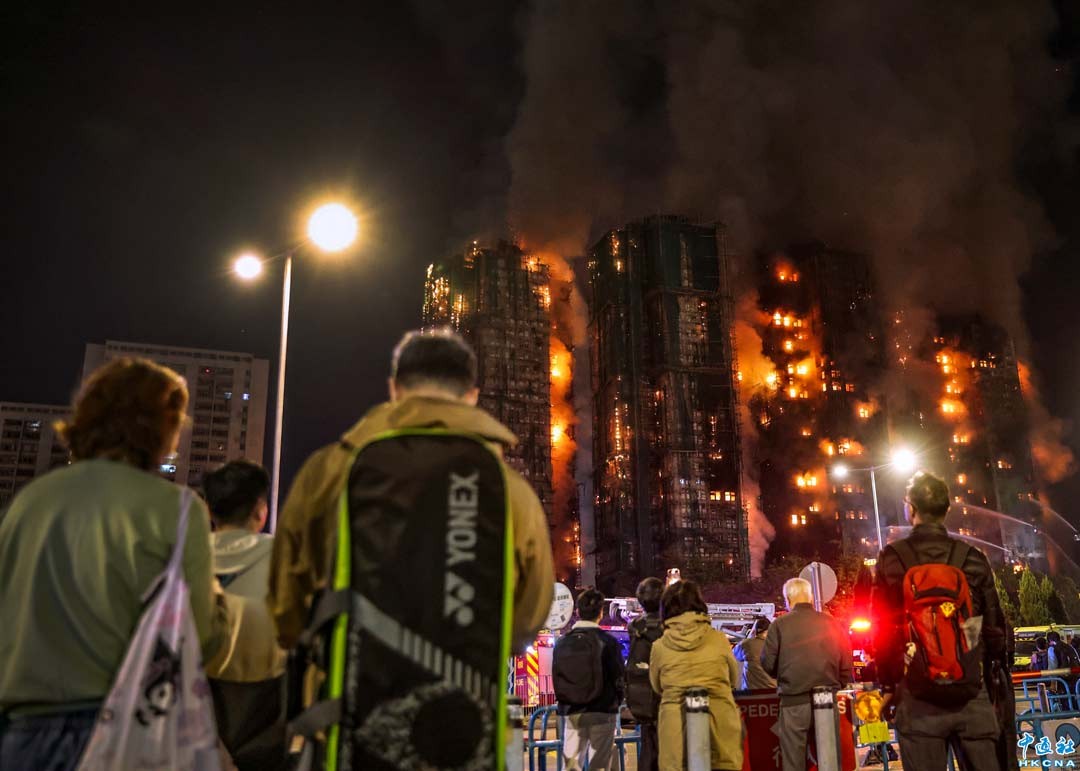 11月26日下午,香港新界大埔一個住宅小區發生火警,火勢迅速漫延,入夜後現場7棟大廈陷入火海。(香港中通社記者 謝光磊 攝)