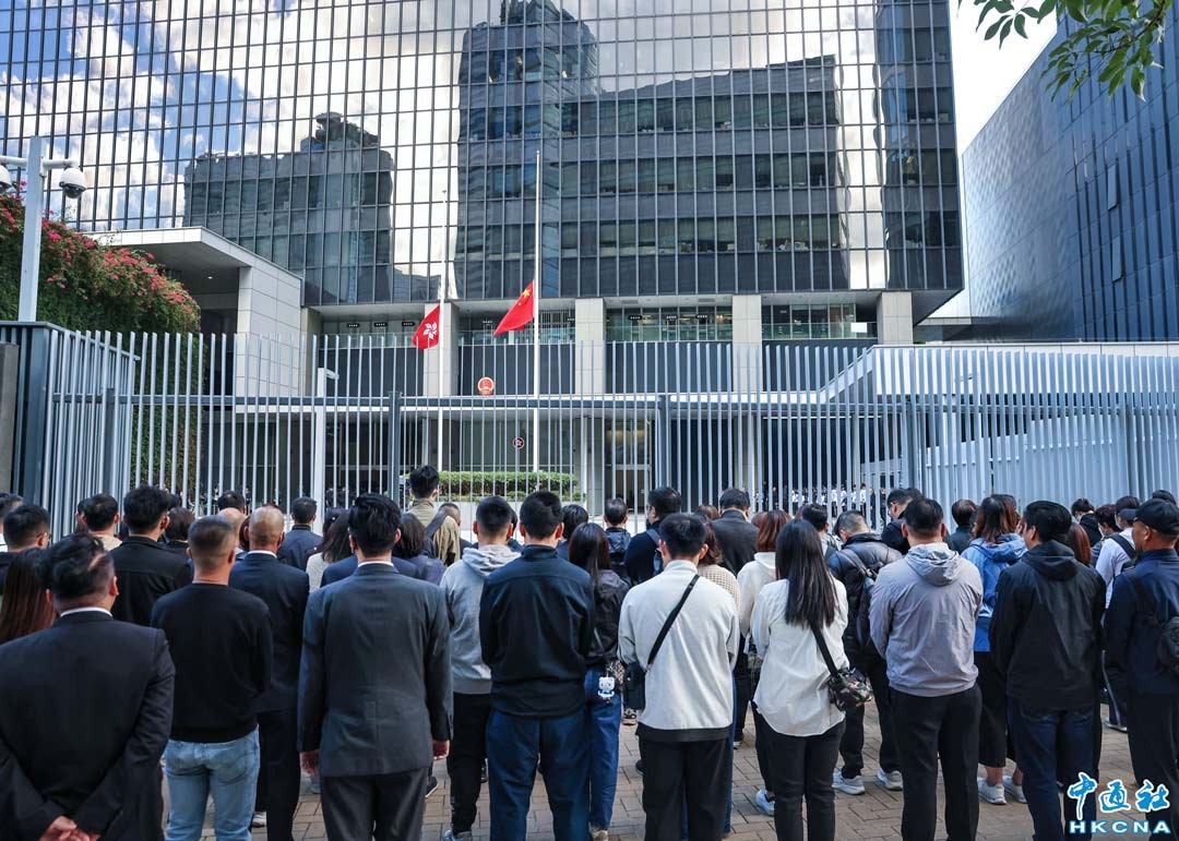 11月29日上午8時,為表達對大埔宏福苑火災罹難者的沉痛哀悼,香港特區政府在政府總部進行悼念活動。政府總部外圍及附近天橋上亦聚集大批市民,眾人肅立觀禮弔唁遇難者,氣氛莊嚴肅穆。(香港中通社記者 謝光磊 攝)