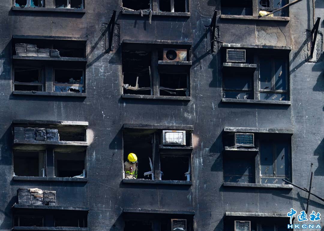 11月27日早上,香港大埔宏福苑五級火焚燒十多個小時後,仍未救熄,截至當天清晨6時,火警至今造成44死58傷。 死者包括一名殉職消防員。 留醫傷者當中有15人危殆、23人嚴重。現場消息指,消防員在火場陸續救出56名傷者。 (香港中通社 陳奕啟 攝)