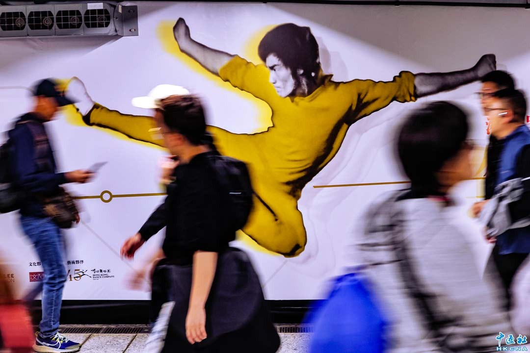 11月25日,許多香港市民及遊客在港鐵中環站內參觀“無形之道:李小龍誕生85周年紀念展”。此次展覽在港鐵香港站和中環站內設置展區,從電影、武術、哲學和藝術四個方面展示李小龍的武術精神和人生哲學。(香港中通社記者 謝光磊 攝)