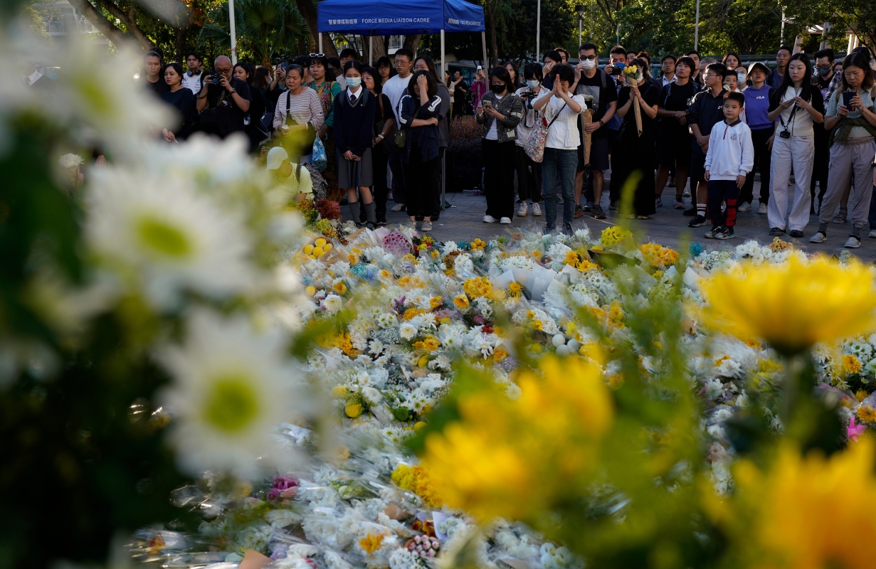 大埔宏福苑火災現場附近的廣福道休憩處繼續有市民排隊到場獻花,