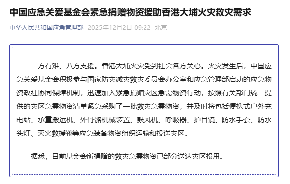 香港中通社12月2日電 香港大埔火災受到社會各方關心。中國應急管理部12月1日表示,火災發生後,中國應急關愛基金會積極參與國家防災減災救災委員會辦公室和應急管理部啟動的應急物資政社協同保障機制,迅速加入緊急捐贈災區急需物資行動。