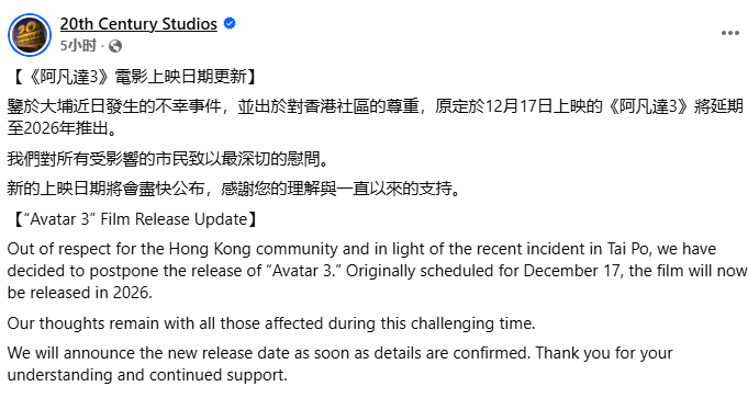香港新聞網12月6日電 電影與電視節目製作發行公司20th Century Studios(20世紀影業)6日在社交平台宣布,鑑於大埔近日發生的不幸事件,並出於對香港社區的尊重,原定於12月17日上映的《阿凡達3》將延期至2026年推出。