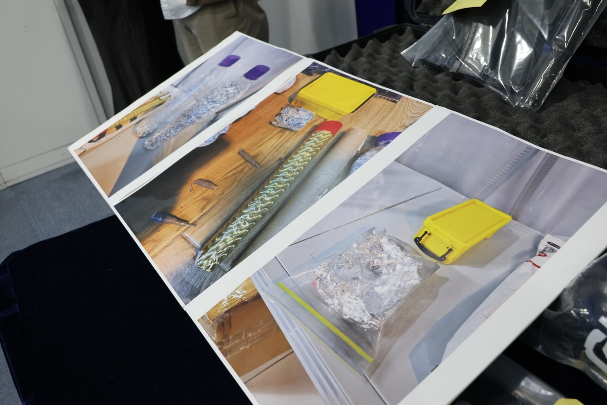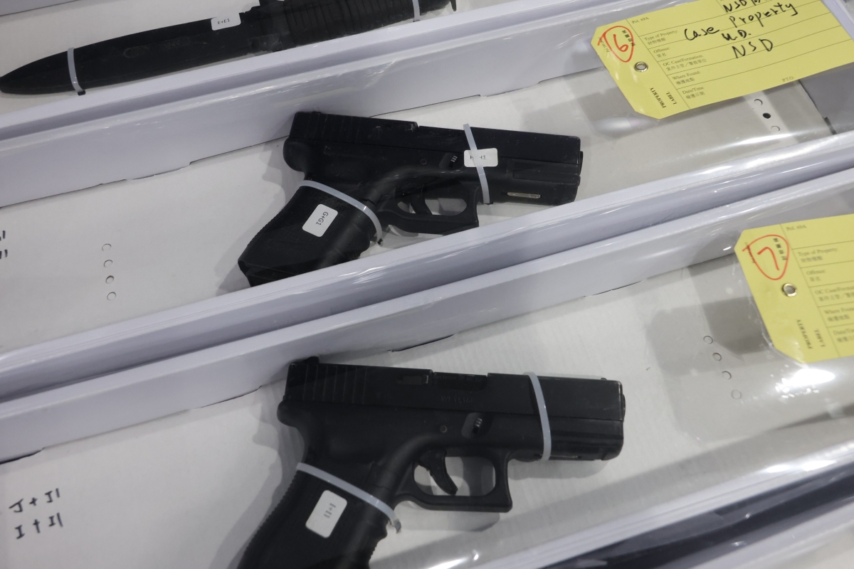 香港新聞網12月12日電(記者 鄧梓傑 ) 12月12日,香港警務處國家安全處(國安處)在警察總部舉行記者會。國安處總警司李桂華稱疑有人組織反政府操練,並首次引用《國安條例》下的“非法操練”罪拘捕9人,繳獲數件非法武器及爆炸物。國安處總警司李桂華(右)及警司周學賢出席記者會講述破案詳情。