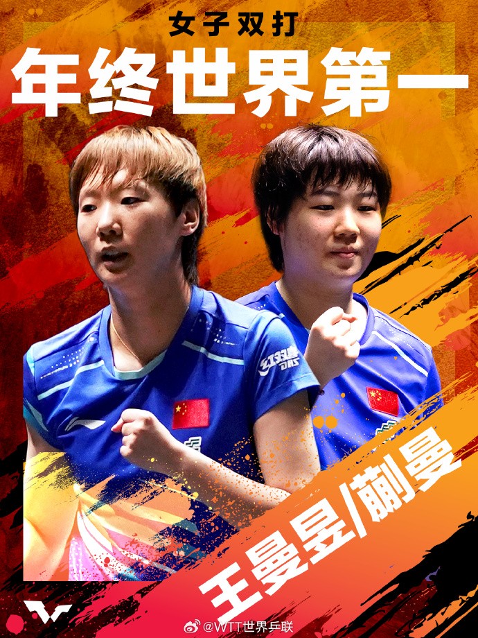 女子雙打年終世界第一:王曼昱/蒯曼 圖源:WTT微博 混合雙打年終世界第一:林詩棟(中國)/蒯曼(中國)