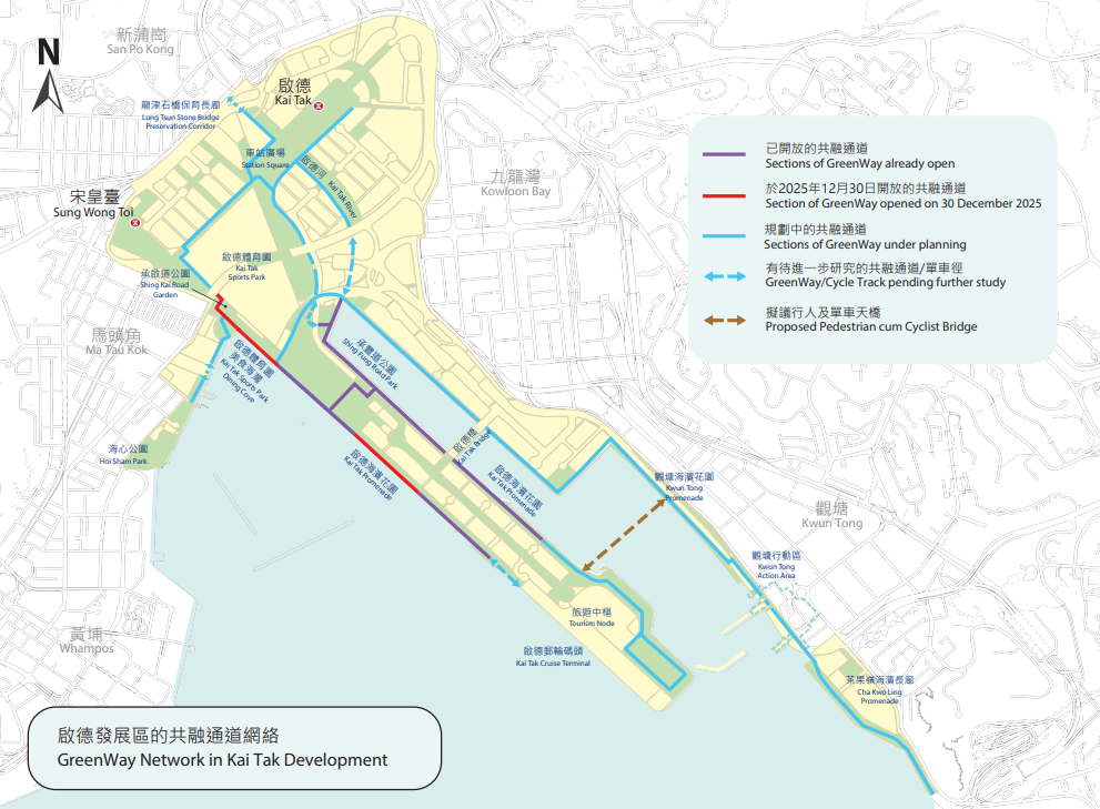 與早前開放的共融通道一致,新段落設有路面標示和指示牌,亦鋪設減速地磚,令行人及騎單車人士能安全共享通道。場內設有單車泊位,共融通道旁設有無障礙行人專用步行徑,為市民提供額外選擇。新段落開放初期會有禮儀大使提供適當提示。此外,啟德體育園會按園區內的活動需要,靈活管理美食海灣內共融通道的開放時間及實施人流管制安排。 啟德共融通道全長約13公里,繼已開放的約4.3公里,預計餘下部分將配合區內政府及私人發展項目,於2026年起陸續落實及開放。(完) 【編輯:譚暢】