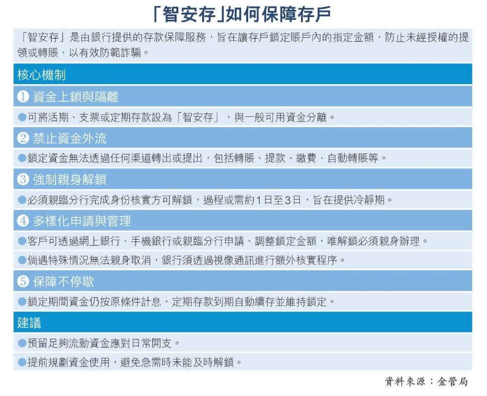 香港“智安存”須親身赴銀行解鎖資金 使用場景有這些香港新聞網12月31日電 香港近年不時有金融詐騙事件發生,為保障存戶資金安全,香港零售銀行業最遲12月31日起全部正式推出“智安存”(Money Safe),讓存戶自行決定使用和自定鎖定保障金額,一經啟動,任何方式都不可轉走資金,要解鎖資金必須由用戶親身到分行或辦事處辦理核實和認證。金管局副總裁阮國恒稱,“智安存”解鎖釋放資金需要較長時間,社會廣泛使用有助防範金融詐騙。 一名78歲長者遺失身份證後,經銀行協助緊急啟用“智安存”,成功鎖定20萬元存款,避免潛在損失;另一名常需離港工作的客戶,亦主動前往銀行分行鎖定七成資金,以策安全。香港銀行公會署理主席紀鷺禧昨日分享這些真實案例時指出,為應對詐騙案而推出“智安存”措施,正為市民“血汗錢”加多層保障。 近年本港詐騙案急升,尤其是電話及網騙,騙徒常誘導受害者即時轉賬,造成巨額損失。為此,金管局去年底宣布推出防騙新招,即“智安存”存款保障措施,旨在針對詐騙手法升級,加強市民自我保護能力。 金管局當時指出,措施於今年初開始分階段試行,最遲於今年底前全面落實實施。今年上半年,陸續有銀行實施試行服務,截至6月底前,14間銀行率先向長者、智障人士及有需要客戶提供暫行措施,優先保障易受騙群體。 所謂“智安存”,用戶可按自身需要決定是否使用,並自定受保護存款額,適用於個人客戶支票、儲蓄、定存戶口,幣種覆蓋港元及主要外幣存款,亦包括聯名戶口。銀行將提供不同渠道以便客戶啟用“智安存”,包括分行、網上及手機銀行等。受“智安存”保護的存款,應繼續享有該存款在沒有“智安存”情況下的利息和優惠。
