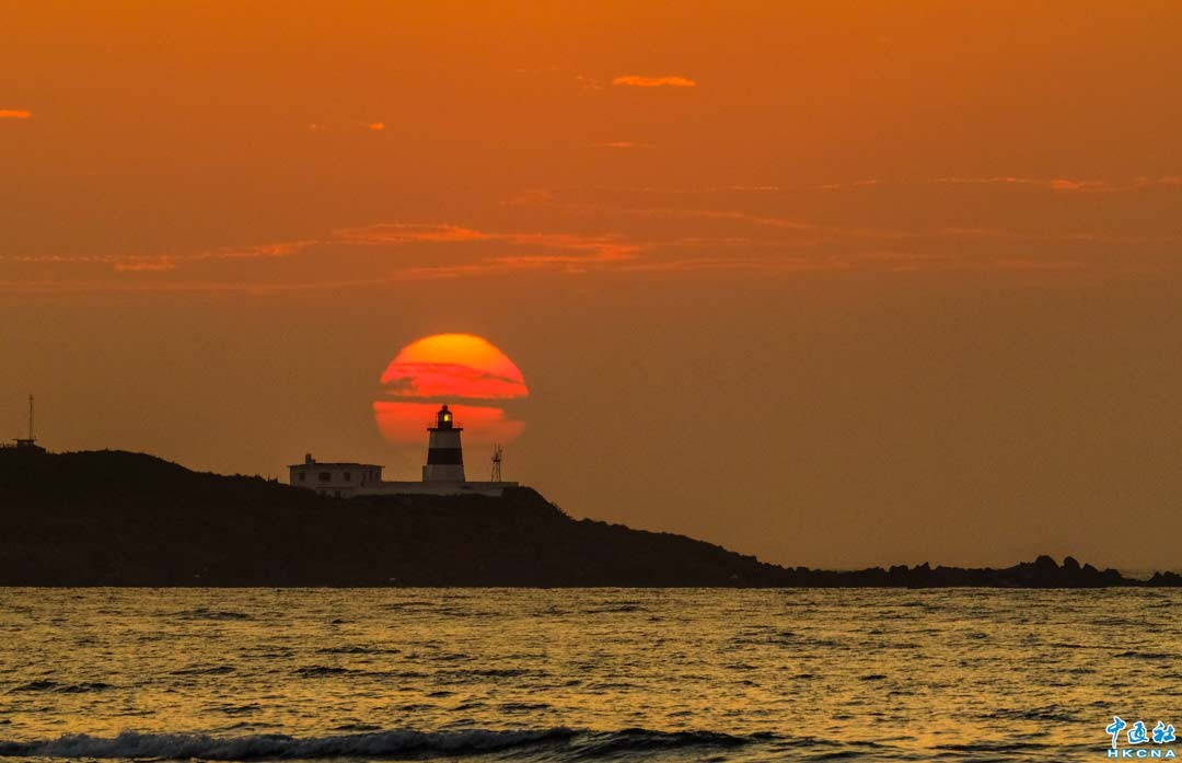 台灣新北市石門區富貴角燈塔懸日時間從4月底到5月初,是欣賞浪漫美景最佳時機,吸引許多民眾及攝影愛好者紛紛聚集在石門漁港海堤,捕捉太陽與富貴角燈塔合而為一的精彩美景。香港中通社圖片