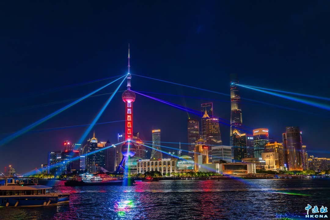 35年前,一聲開發開放的號角,讓浦東從一片阡陌縱橫的鄉野,蛻變成現代化都市的耀眼明珠,成為上海最耀眼的名片。陸家嘴高樓林立,東方明珠廣播電視塔閃耀著五彩光芒,夜幕降臨,華燈初上,霓虹閃爍,盡顯繁華與活力。圖為“浦東開發開放35周年光影秀”點亮黃浦江。(蔡志東 攝)