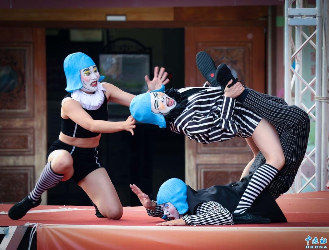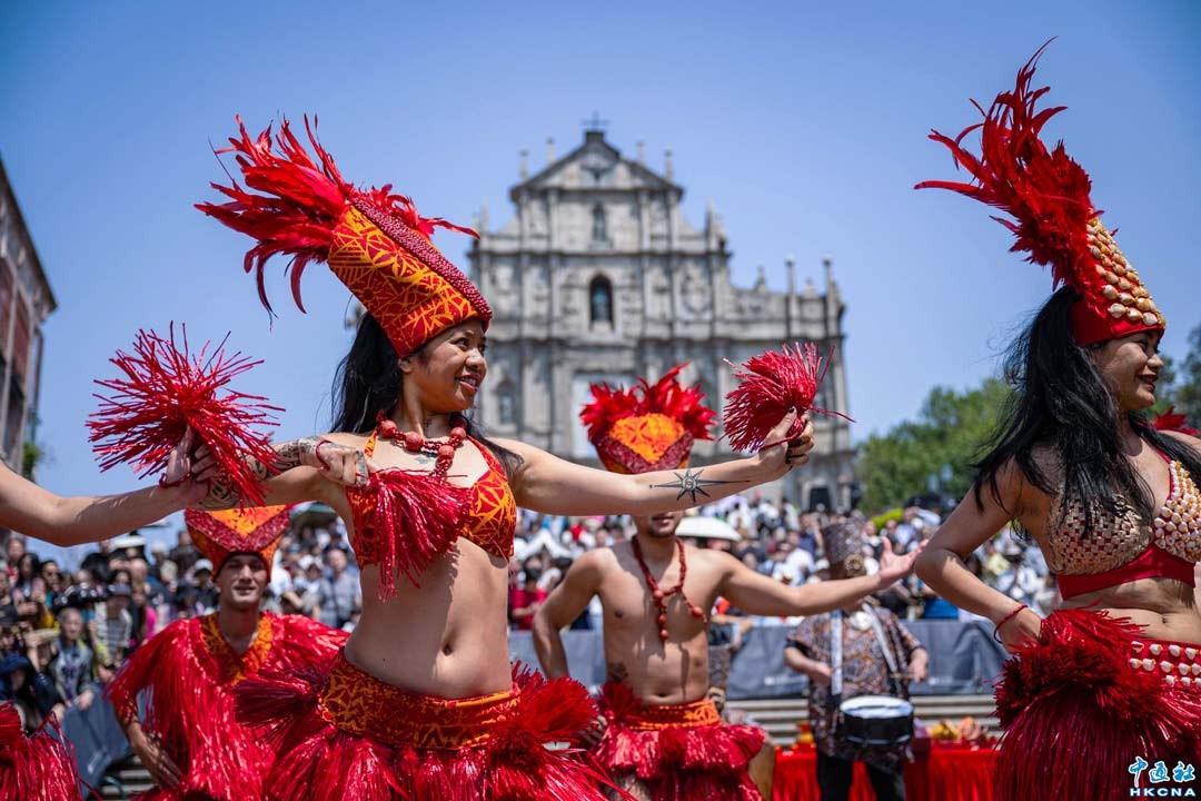 2025年3月21日,儀式前的暖場演出。當日,慶祝澳門回歸祖國二十六周年“2025澳門國際幻彩大巡遊”拜神儀式在大三巴牌坊耶穌會紀念廣場舉行,儀式前設有暖場演出。 香港中通社圖片