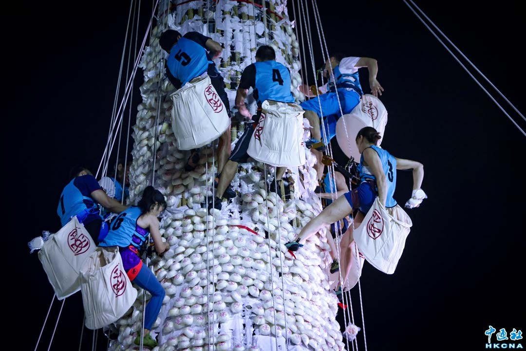 2025年5月6日凌晨0時,“包山嘉年華2025”壓軸項目“搶包山決賽”在長洲北帝廟遊樂場足球場舉行。12名健兒進行一番激烈角逐後,最終郭嘉明及龔子珊分別奪得“包山王”及“包山後”,而“代代平安獎”由葉建文奪得。(香港中通社記者 謝光磊 攝)