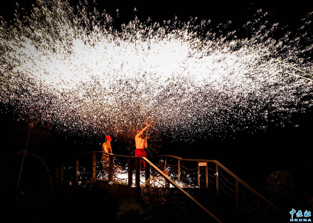 重慶市為激活“夜經濟”,近年來引入特色文旅資源,在陶然居國潮美食街區,一年365天免費為遊客舉辦非遺技藝民俗展演,包括非遺技藝變臉吐火和打鐵花表演,同場還有火壺和風火輪的表演,為山城夜晚增添別樣魅力。圖為打鐵花表演,表演者快速有力地揮舞鐵鎚,1600℃的熾熱鐵水沖天而起,瞬間化作漫天金花,如銀河倒瀉。 (香港中通社記者 徐文峰 攝)