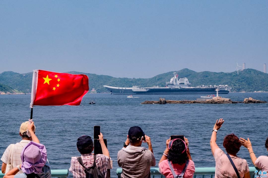 2025年7月7日,中國人民解放軍海軍山東艦航母編隊離開香港,結束為期5天的訪港行程。圖為大批市民到海怡半島海濱送別山東艦。(香港中通社記者 許其皓 攝)