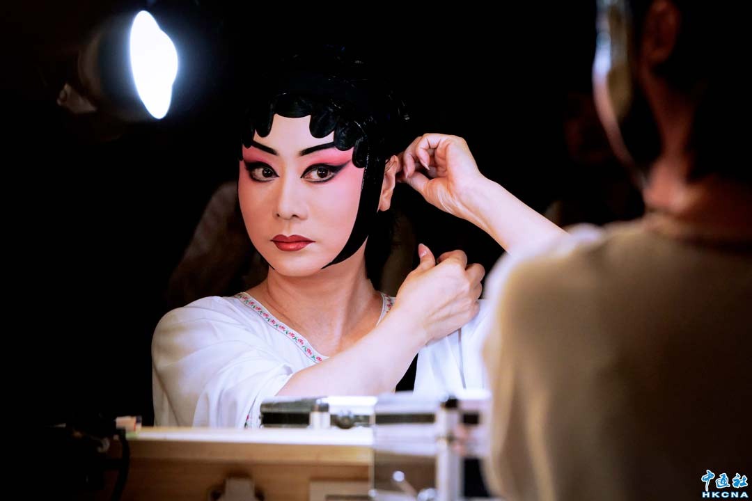 中國戲曲學院名家、教授等80人,2025年8月12日至17日在台灣台北戲劇院登台。台灣雖然遭逢颱風“楊柳”侵襲,但是演出如常進行,團員們在演出前也毫不鬆懈,加緊練習,為演出做好準備。圖為中國戲曲學院名家李勝素在《鳳還巢》的化妝雍容華貴。 香港中通社圖片